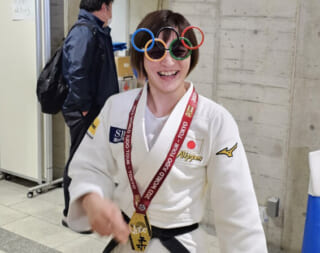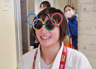 角田が五輪のサングラスをかけて笑顔。昨年12月のGS東京の舞台裏にて。すでに金メダルのイメージができていたかのようだ。