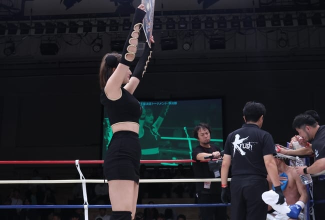 空手黒帯ラウンドガール、“鍛えた太腿”ミニチャイナで登場!ハロウィン姿に会場沸く[2025/10/27]