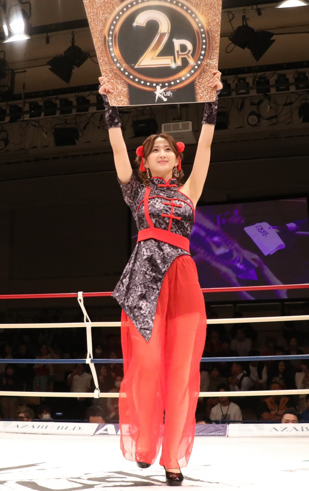 空手黒帯ラウンドガール、“鍛えた太腿”ミニチャイナで登場!ハロウィン姿に会場沸く[2025/10/27]