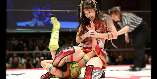 上原わかな、ウエストと同じ太さの太腿でバナナピローを仕掛ける!(東京女子プロレス)