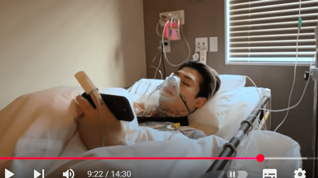 術後、ベッドの上でお笑い芸人の映像を見て気を紛らす平本(『平本蓮 BLACKROSE』)