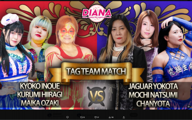 26年1月、井上京子&柊くるみ&尾﨑妹加のビジュアル vs ジャガー横田&夏実もち&ちゃんよたの6人タッグマッチ(@sym_yok)