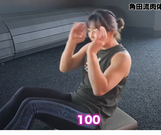 ダラスでトレーニングする角田。腹筋100回(角田夏実YouTubeチャンネルより)