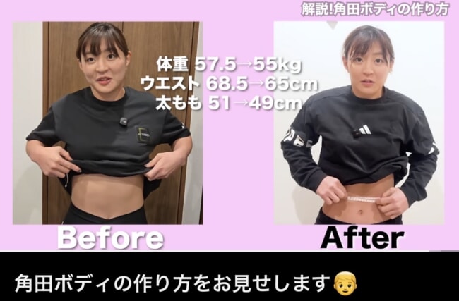 体重55kg、ウエスト65cm、太もも49cmの「角田ボディ」(角田夏実YouTubeチャンネルより)